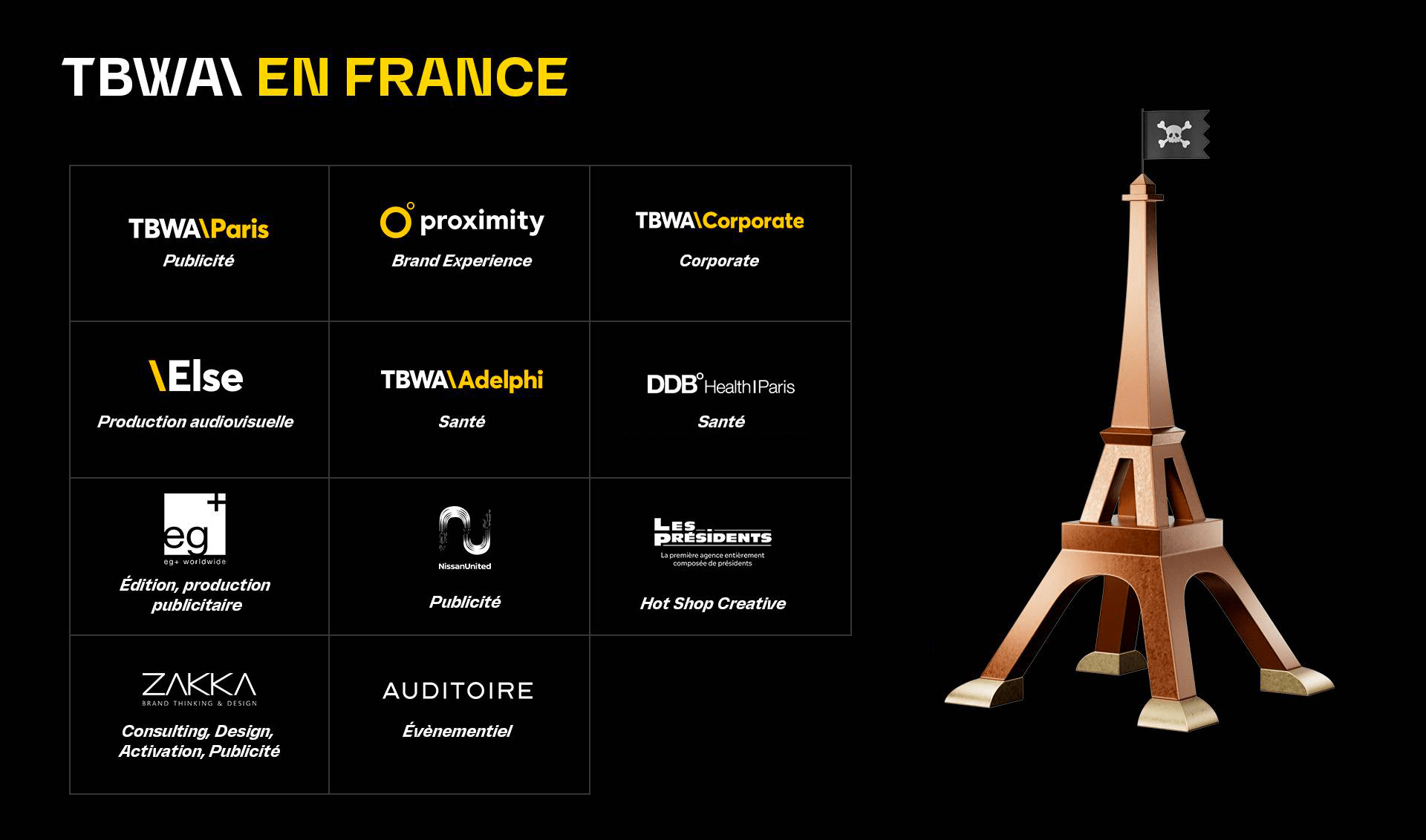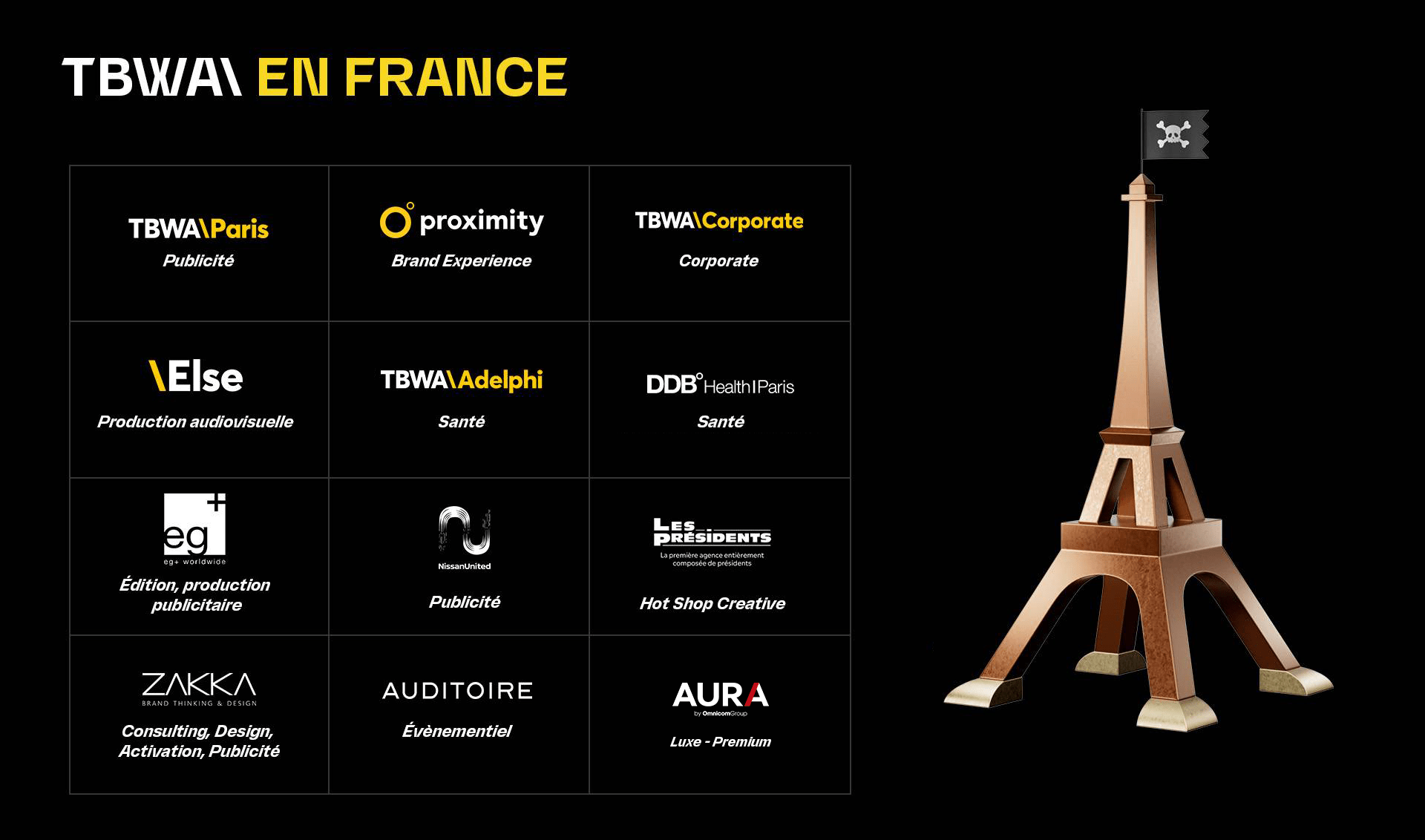 TBWA\Paris est l’agence de publicité principale en France du réseau TBWA\, l’un des 10 premiers réseaux mondiaux (Groupe Omnicom), présent dans plus de 40 pays. L’agence parisienne est la troisième agence de communication sur le marché français. Nous créons des idées disruptives pour des clients tels que McDonald’s, Nissan, Air France, Schweppes…