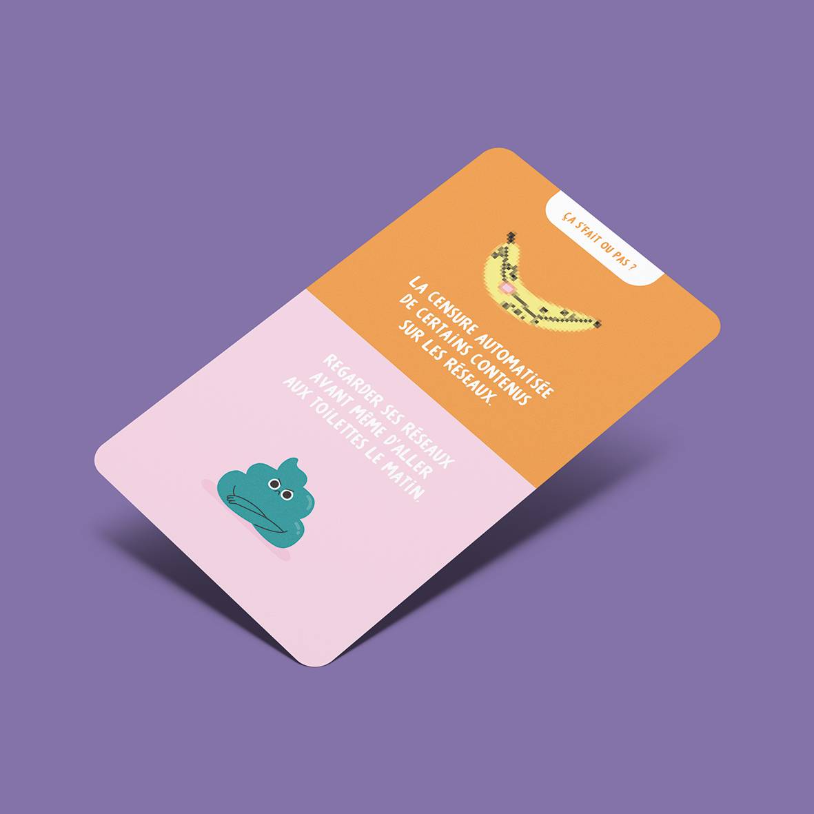 Le jeu lance des discussions autour de 5 thématiques de questions : pour ou contre ? / ça s’fait ou pas ? / qui de nous… / t’y crois ou pas ? / c’est quoi le pire ?